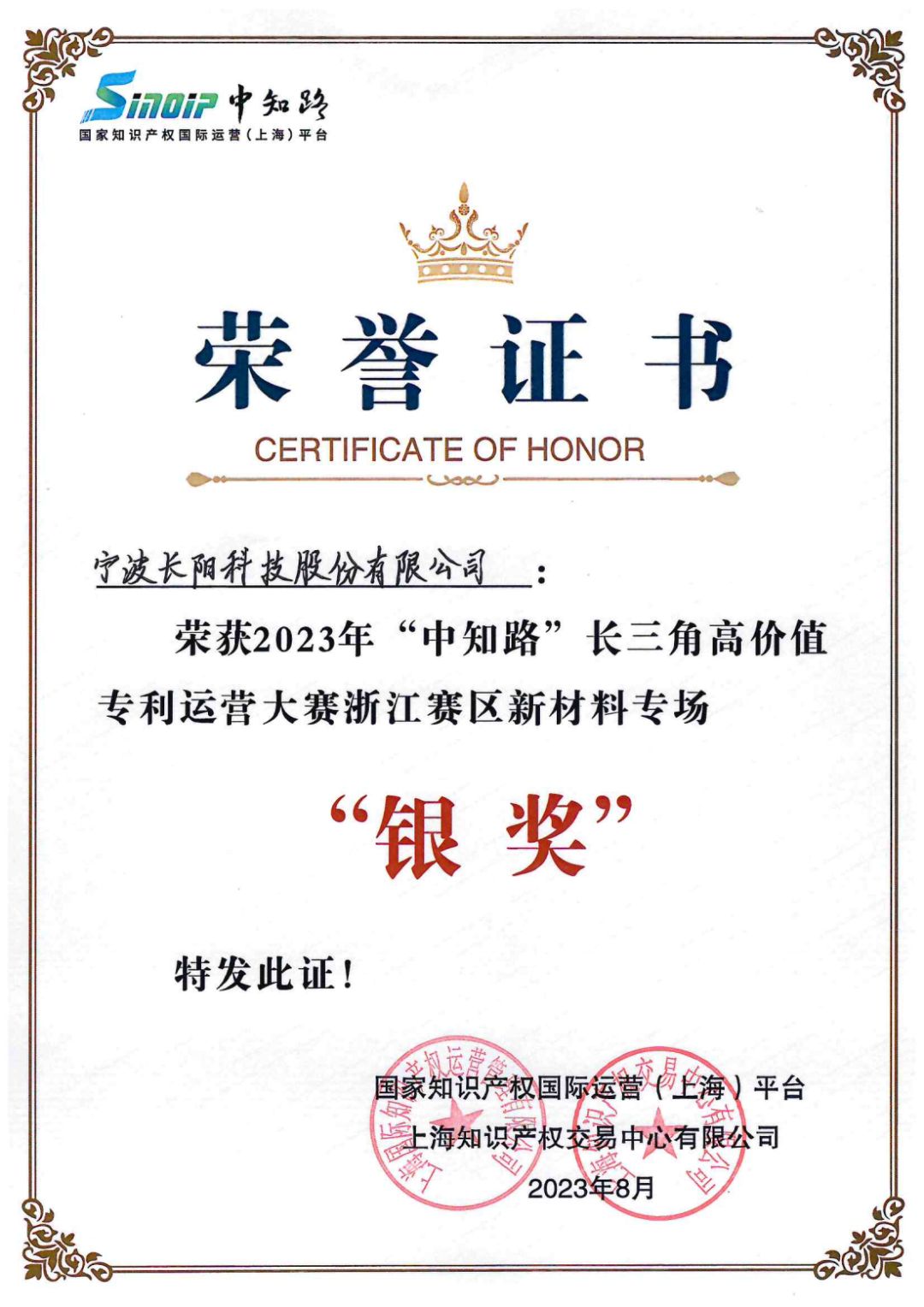 2023年8月3日下午,由国家知识产权国际运营(上海)平台、上海知识产权交易中心有限公司、江苏国际知识产权运营交易中心有限公司、浙江知识产权交易中心有限公司、安徽省产权交易中心有限责任公司联合主办的2023年“中知路”长三角高价值专利运营大赛浙江赛区在宁波阳光豪生大酒店的三楼豪生厅正式启动。宁波蓝狮科技股份有限公司荣获2023年“中知路”长三角高价值专利运营大赛浙江赛区新材料专场银奖。